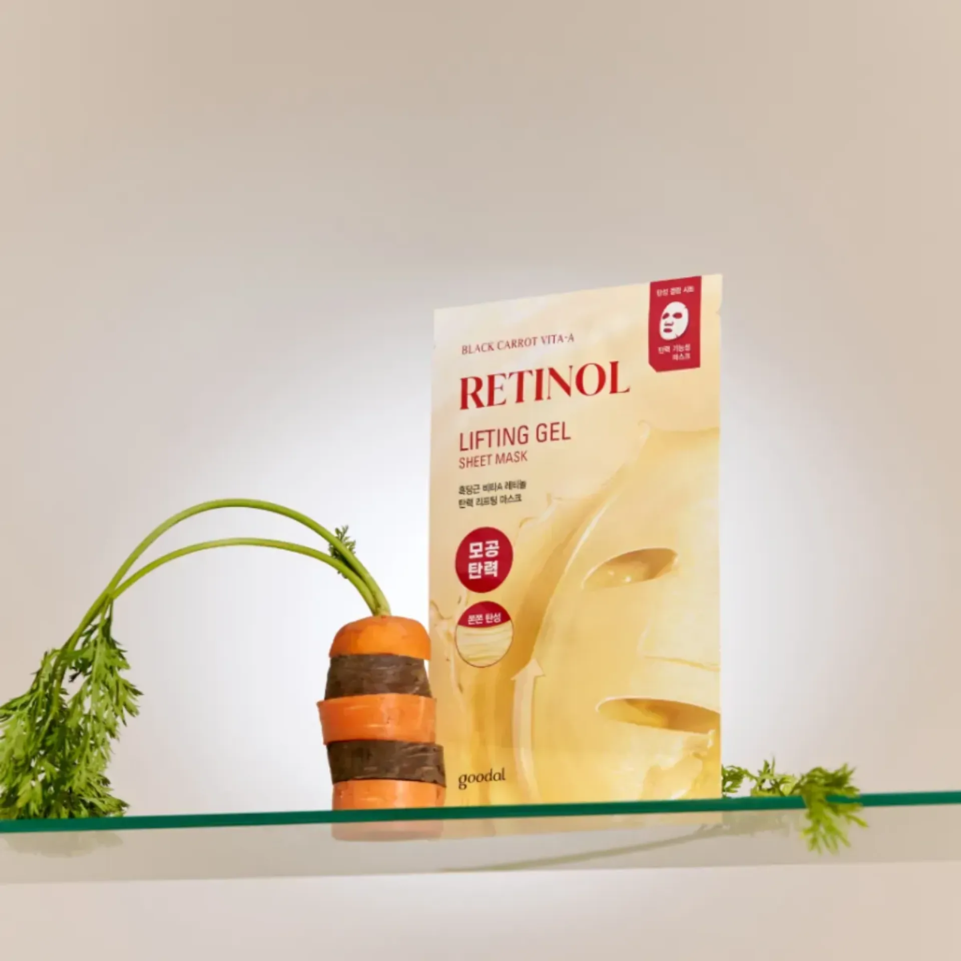 The Goodal Black Carrot Vita-A Retinol Lifting Gel Sheet Mask is an advanced anti-aging treatment infused with retinol derived from black carrots and vitamin A. This luxurious gel mask targets fine lines, firms sagging skin, and revitalizes dull complexions. Its gentle yet effective formula delivers powerful lifting and brightening benefits while deeply hydrating the skin.