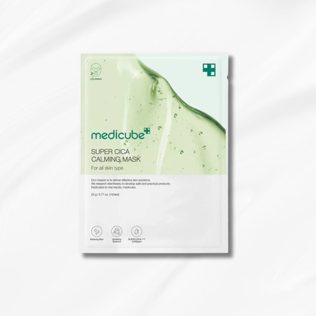 The Medicube Super Cica Calming Mask is a soothing sheet mask infused with Centella Asiatica (Cica) and skin-loving ingredients to calm irritation, reduce redness, and deeply hydrate the skin. Perfect for sensitive and stressed skin, this mask provides an instant cooling effect while strengthening the skin barrier for a healthier, more balanced complexion.